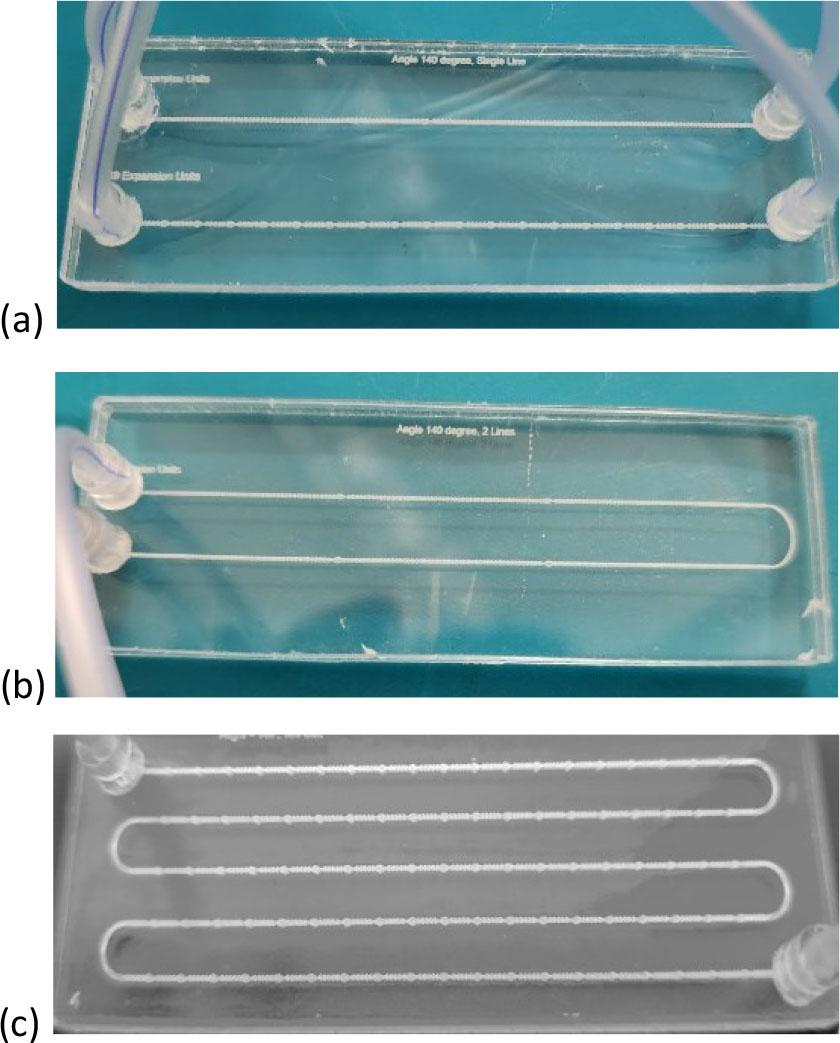 The fabrication utilized a CO2 laser machine (VLS3.5, Universal Laser Systems, Kanagawa, Japan) with a 30-watt laser tube. A laser lens (HPDFO, Universal Laser Systems, Japan) with a 30 µm focal spot was utilized. Microfluidic chips were fabricated using PMMA sheets that were 3 mm thick for the top and bottom layers and 0.1 mm thick for the design layer. To achieve high-quality results, the laser beam for patterning PMMA sheets was adjusted to 1000 pulses per inch (PPI). The laser power was set to 30% and the speed to 40% to achieve the optimal dimensions as specified in the design. The chip is composed of three layers of PMMA. The chip design was executed using CorelDraw ×5. The design was thoroughly engraved on the middle layer, whereas the inlet and outlet were drilled into the top layer. The three layers were thermally adjusted and bonded in a natural ventilation laboratory oven (STF-N 80, FALC Instruments, Treviglio, Italy) for 13 minutes at 150 °C under a force of 2 Newton. Subsequently, connection tubes with an outer diameter of 1.8 mm (ULTRAMED, Assiut, Egypt) were attached and secured at the inlet and outlet openings. The tube has an outer diameter of 1.8 mm, while the inlet and outlet holes measure 2 mm. Consequently, a PMMA cylinder with an outer diameter of 2 mm and an inlet diameter of 1.8 mm was incorporated to connect the tubes to the holes, ensuring a leak-free connection. Figure 5 shows the actual fabricated chips.