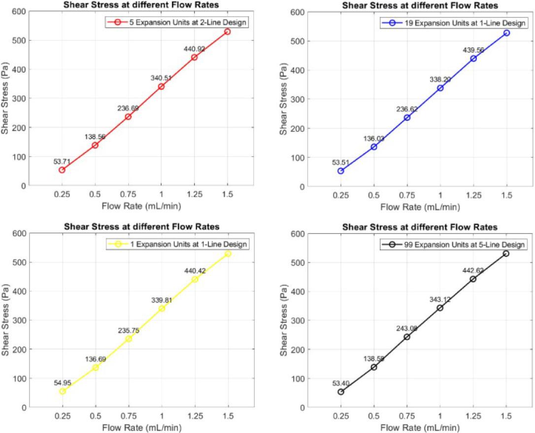 In the Ansys results section, the wall shear stress was studied. The maximum shear stress occurs at the beginning of the first pair of teeth. Different flow rates were applied to evaluate the effect of varying the number of expansion units upon the shear stress. Figure 8 describes the maximum shear stress applied to each design’s first pair of teeth at different flow rates, such as 0.25, 0.5, 0.75, 1, 1.25, and 1.5 mL/min.
