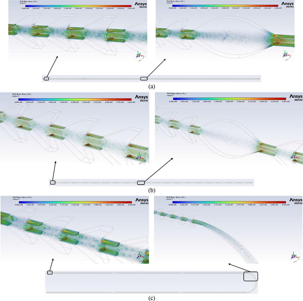 Figure 8 illustrates a negligible difference across the designs, indicating that various numbers of expansion units do not influence the shear stress exerted on the oocytes. These chips will undergo testing with actual oocytes in the laboratory to evaluate denudation efficiency. Figure 9 (a), (b), (c), and (d) present the CFD simulation results (vector or contour) for the three chips.
