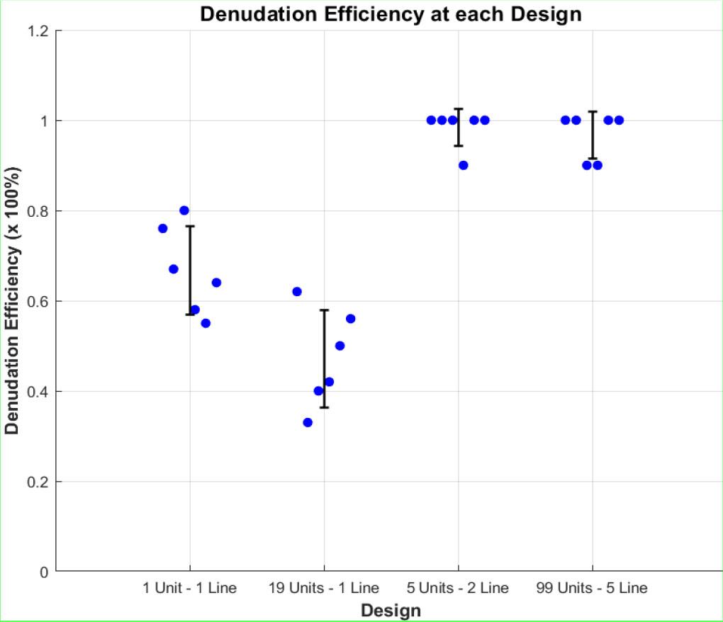 As seen in Figure 10, the highest denudation efficiency occurs at chip B and chip C. Chip B consists of 5 expansion units at a 2-line design and achieved almost 98.33% denudation efficiency. Chip C comprises 99 expansion units at a 5-line design, achieving almost 96.67% denudation efficiency. Efficiency decreased dramatically in chip A, reaching 66.67% at the first and 41.17% at the second channel. Error bars represent Standard Deviation (SD), which measures how much individual data points deviate from the mean of the dataset.