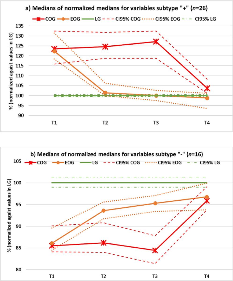 Complete list of variables included in the study (n=44) with units, type, subtype and medians_ In the LG, a single measurement was carried out, while, in the OG, measurements were taken at four different times (T1-T4, see Figure 1 in the main text)_ Data of the two OG subgroups (COG and EOG) were pulled together, and pre and post values were considered as follows: pre values, for the EOG, were those taken at week 1 (T1) and, for the COG group, those taken at week 8 (T3); post values for the EOG were those taken at week 3 (T2), and, for the COG, those taken at week 10 (T4)_ The list is ordered by the last column, which shows the relative change (as %) of the median value of each variable in the week following the treatment (post) compared to those taken in the previous week (pre)_