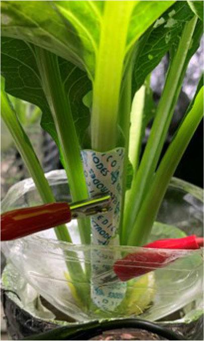 Experimental setup for EIS measurements. Two ECG electrodes were noninvasively attached to the petiole of a Komatsuna plant with an electrode separation of approximately 25 mm, enabling in situ impedance measurements without tissue penetration.