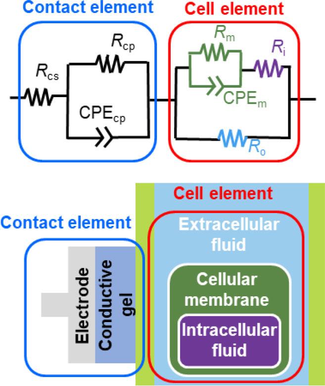 Equivalent circuit model used for analysis of EIS data obtained from plant tissues. The model consists of a contact element representing the electrode–plant interface and a cell element representing the electrical properties of plant tissues, including intracellular and extracellular fluids and membrane-associated components.