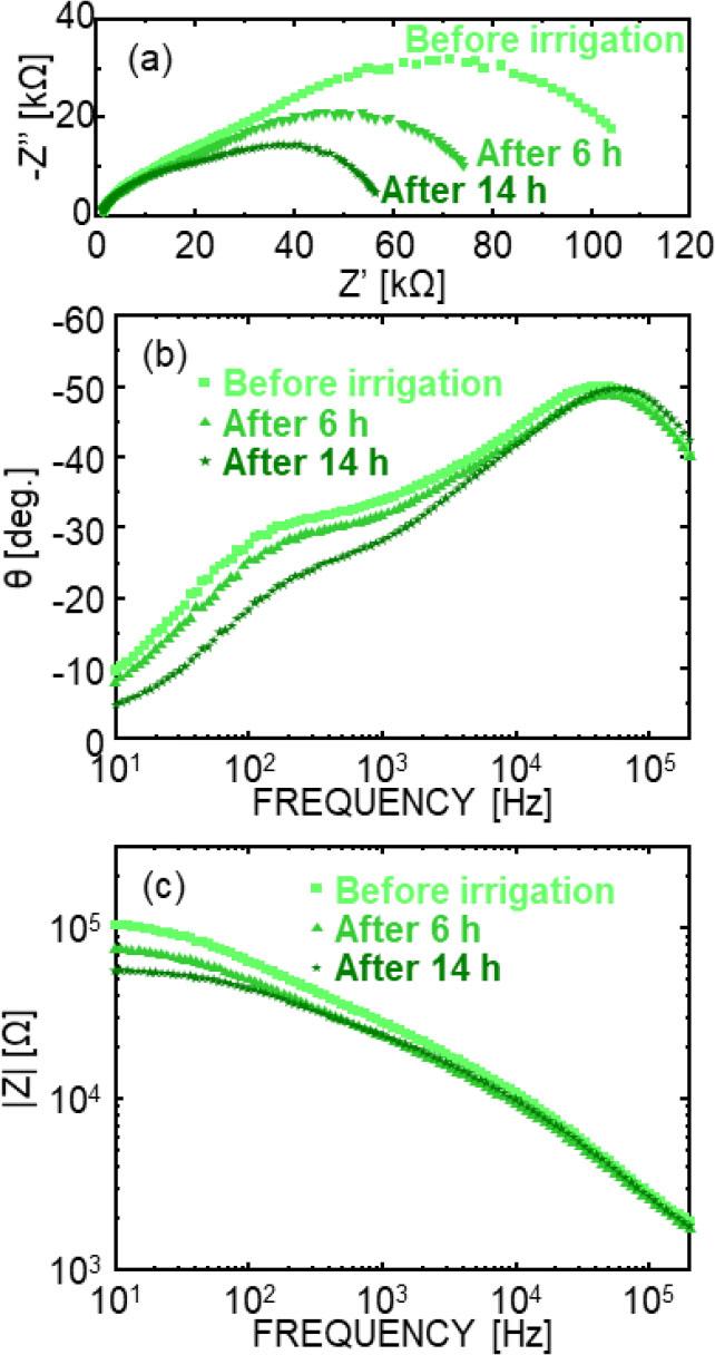 First, the ability of EIS to observe biological changes in the Komatsuna, caused by irrigation was evaluated, since water is a key factor that affects plant growth. Given the time-resolved and measurement-intensive nature of the experiment, the following results focus on representative impedance responses. At the same time, similar temporal trends were reproducibly observed across multiple independently measured plants. Figure 3(a) shows the representative Nyquist plots of the Komatsuna over time after irrigation, in which the horizontal axis represents resistance and the vertical axis represents reactance. Figures 3(b) and (c) show Bode plots of the amplitude |Z| and phase θ of the petioles of Komatsuna, respectively.