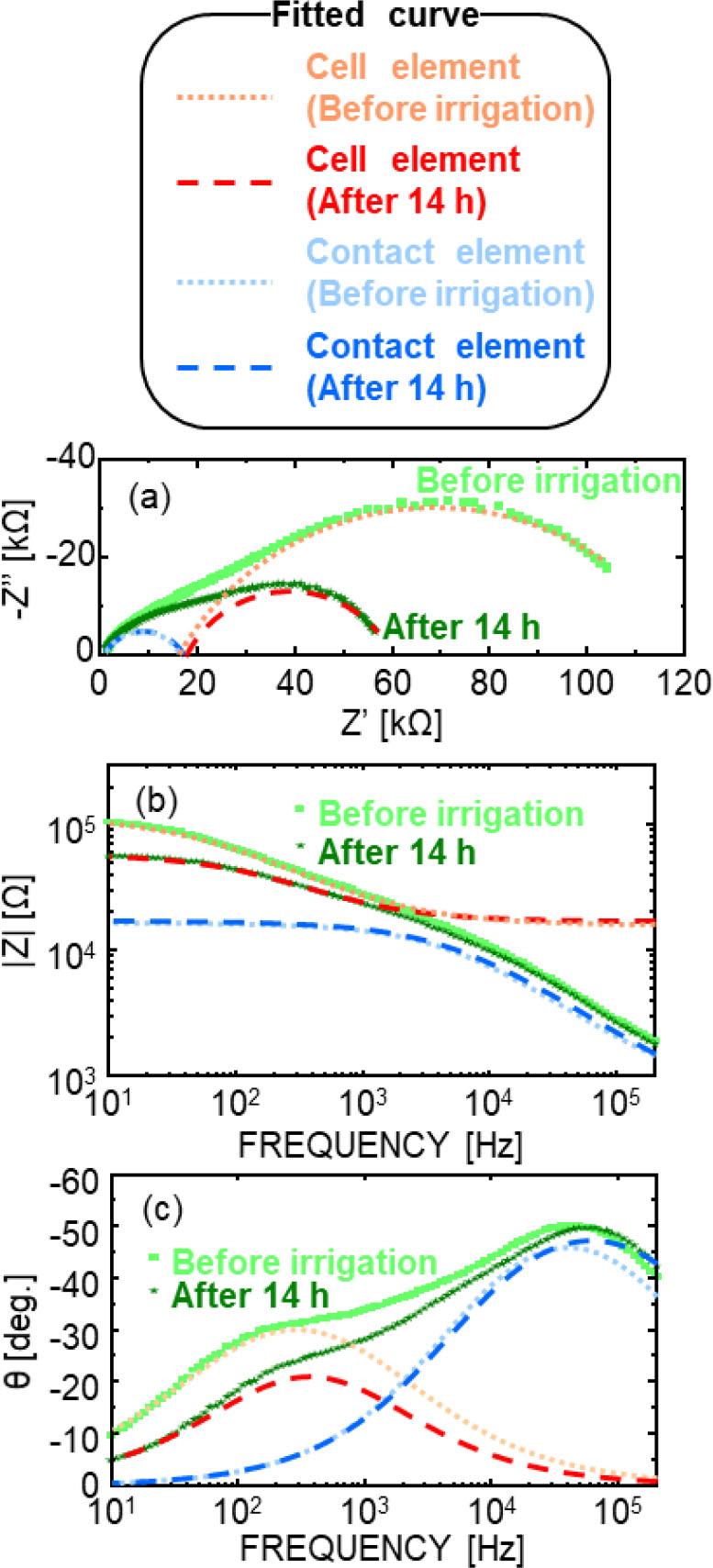 Figures 4(a–c) show the Nyquist plots and Bode plots of |Z| and θ, along with the fitting results and their separation into cell and contact elements. The fitted curve is consistent with the experimental data over the entire frequency range. The fitting parameters presented here represent typical values obtained from repeated measurements, and the overall temporal trends were reproducible, although minor variations in absolute values were observed among individual plants. The estimated parameters are as follows: contact element: Rcs = 102 Ω, Rcp = 104 Ω, CPE-p = 0.7, CPE-T = 10−8; cell element: Ro = 104–105 Ω, Ri = 102 Ω, CPE-p = 0.7, CPE-T = 10−7. Rm, which represents a small current through the cell membranes, was fixed at Rm = 1010 Ω, which is three orders of magnitude larger than Ro. The fitting results shown in Figs 4(a–c) correspond to a representative impedance spectrum and are not averaged values. Considering the variability observed among individual plants, the reported parameter values are presented with limited significant digits to avoid overinterpretation of fitting precision. Changes were observed in the cell element over time after irrigation, whereas the contact element remained constant within the experimental uncertainty. This separation supports the validity of the equivalent circuit approach for distinguishing plant-related impedance changes from those originating at the electrode–plant interface. These results indicate that the fitting analysis can reasonably isolate changes associated with plant water conditions, even in noninvasive surface measurements.