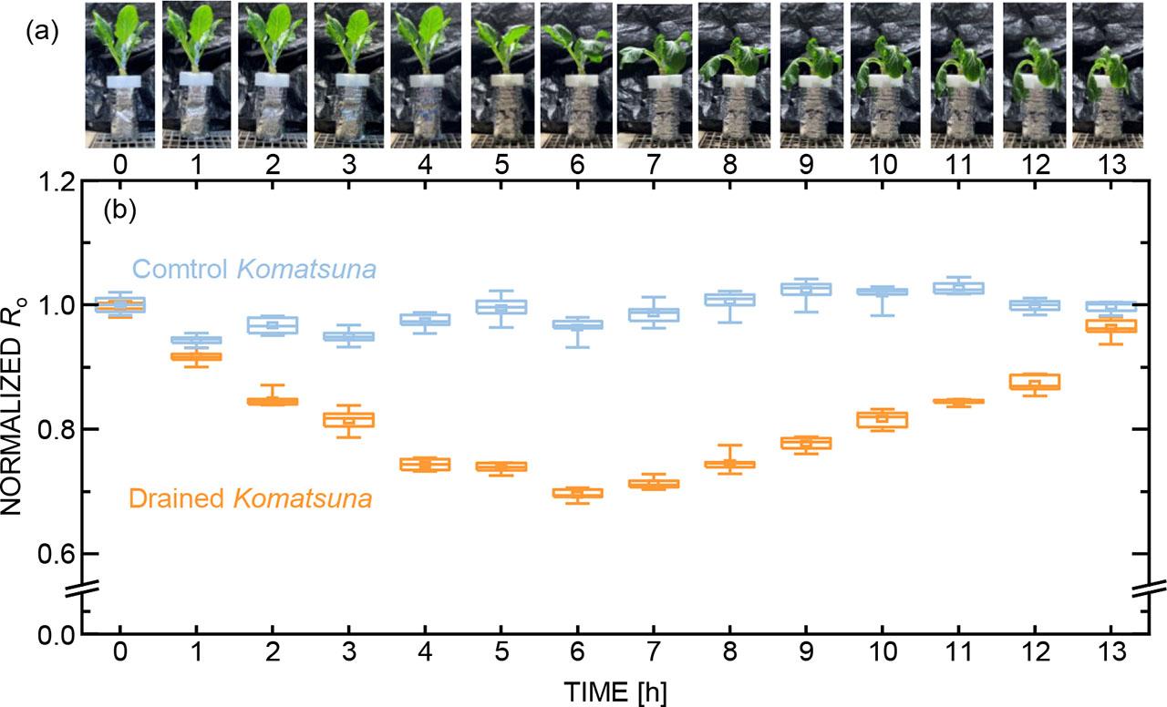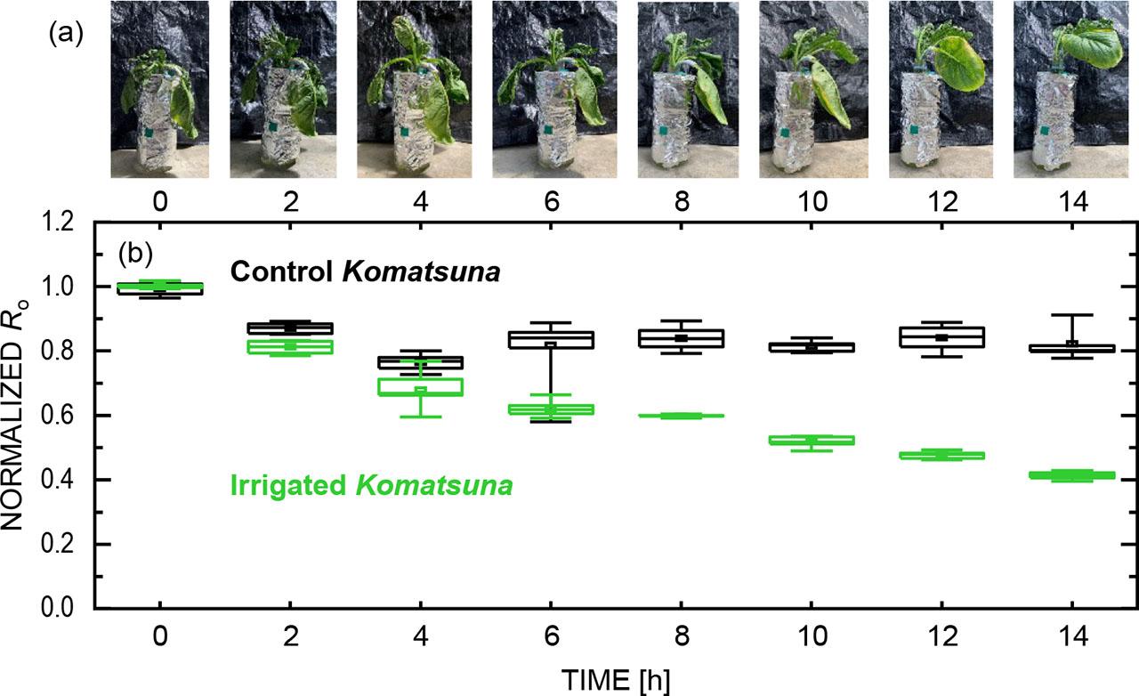 Physiological and electrical responses of Komatsuna during irrigation. (a) Time-dependent changes in the visual appearance of irrigated plants. (b) Normalized Ro values derived from equivalent circuit fitting as a function of elapsed time after irrigation, shown for irrigated and control conditions.