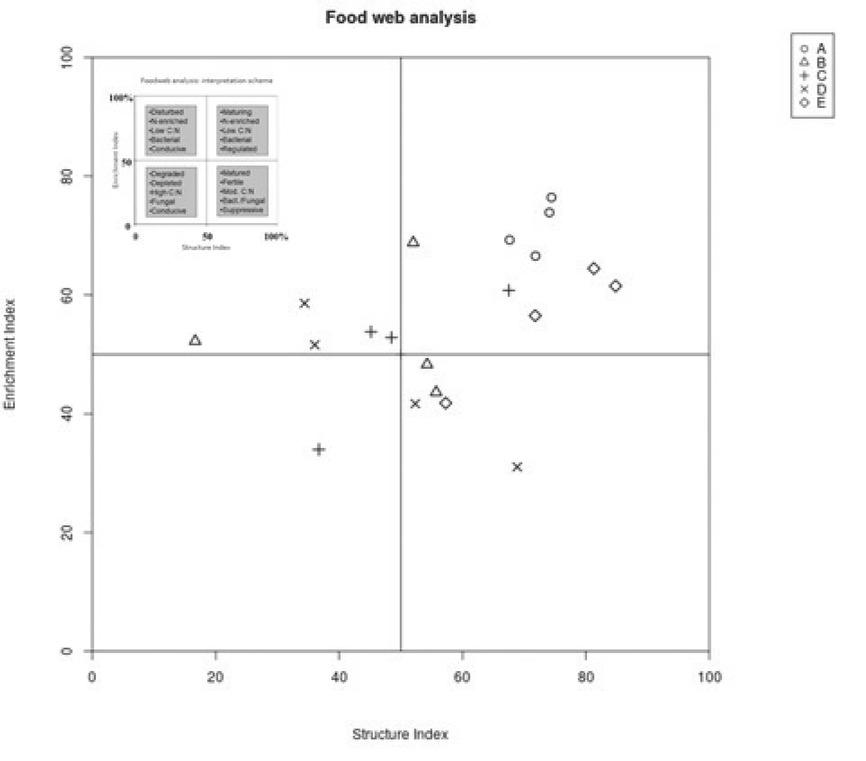 | Bacterivores | 1160.6 ± 604.5a | 218.6 ± 56.3b | 115.6 ± 44.9b | 139.9 ± 56.8b | 284.3 ± 119.9b |