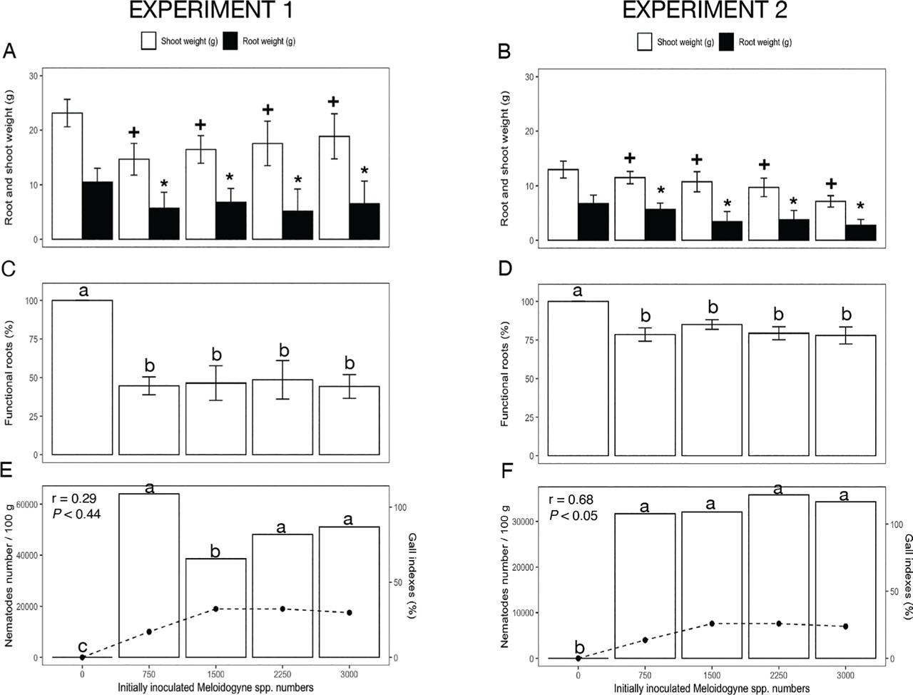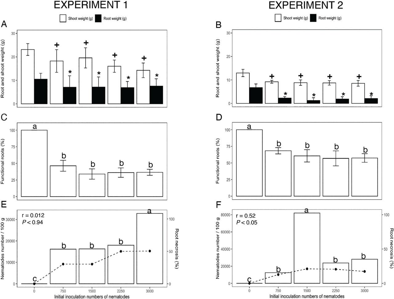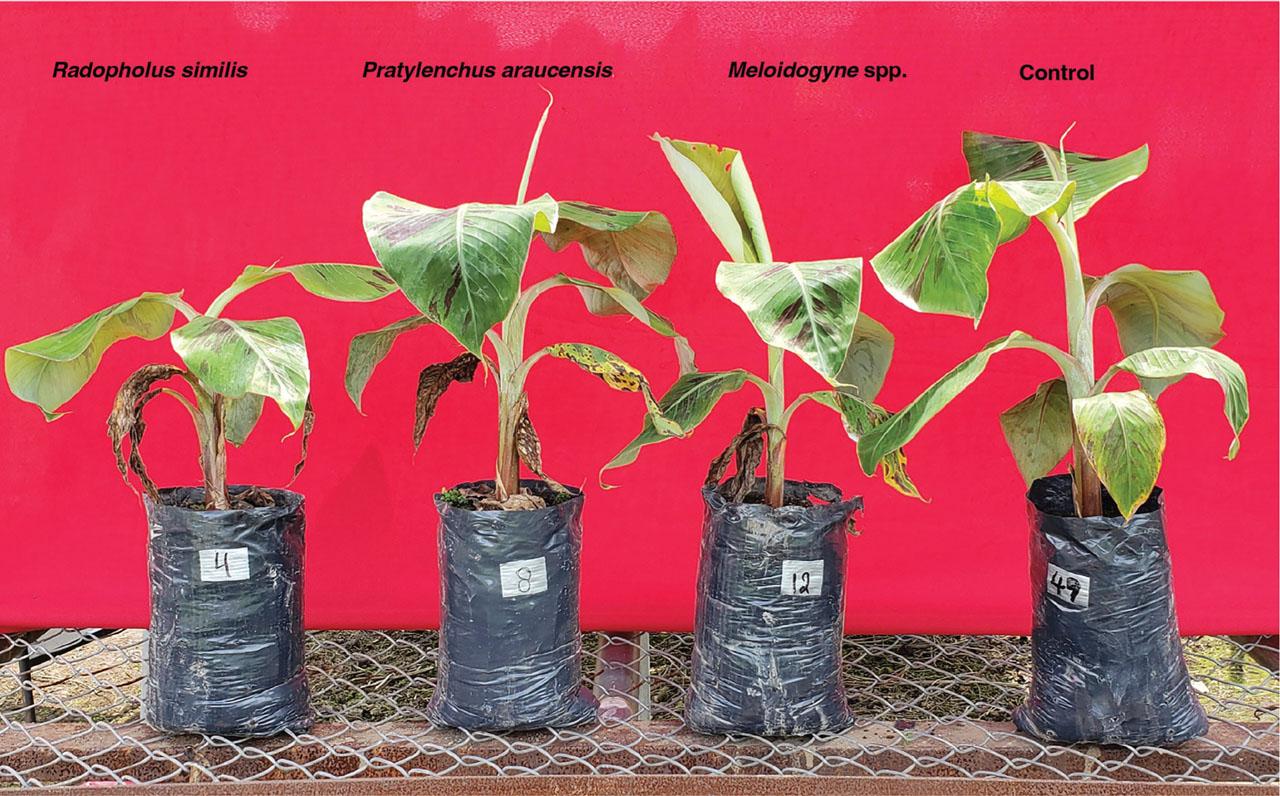 Plantain growth of (height and number of leaves) and number of root bases (places where roots attach to the corm) on the sucker showing lesions by nematodes on Musa AAB ‘Dominico Hartón’ inoculated with varying initial densities of Radopholus similis, Pratylenchus araucensis, Meloidogyne spp_ and the mixture of 750 R_ similis + 750 P_ araucensis + 750 Meloidogyne spp_ and the mixture of other proportions (1,500, 2,250 and 3,000 of each species of nematodes)_