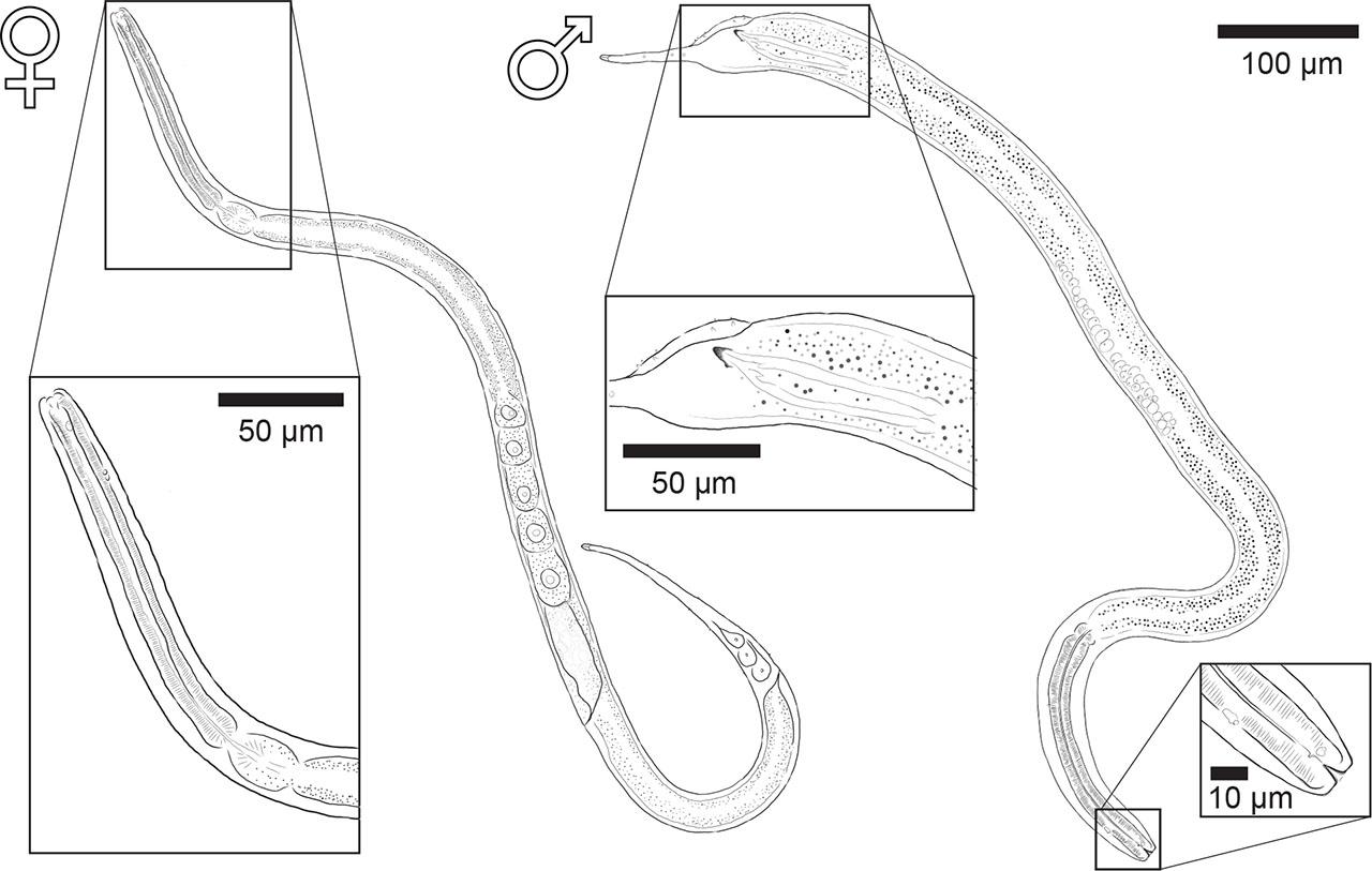 Diplolaimelloides woaabi sp. nov. Left: holotype female with anterior end inset. Right: holotype male with anterior and posterior end inset, to scale.