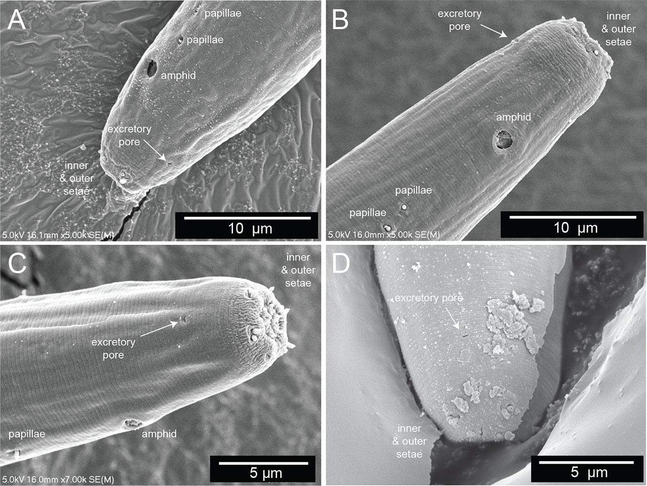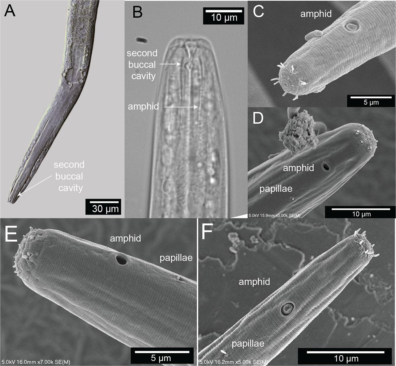 The lip region is continuous with the body contour but slightly tapered rather than fully cylindrical. The oral opening is terminal and leads to a double cavity with a slight constriction in the middle portion dividing the cavity into two compartments (Figs. 7A,B). No denticles observed in the anterior buccal cavity, which is funnel shaped with cuticularized walls, relatively deep and narrow (Table 1). The basic pattern of the anterior region consists of six peri-oral plates radially arranged around the terminal oral opening: two subdorsal, two subventral, and two lateral. The lips appear completely fused such that the anterior end of the nematode shows a subtle hexagonal, compressed region (Figs. 7C,D). The head carries a concentration of anterior sense organs in two circlets of sensilla (sensory papillae) which surround the stoma opening (Figs. 7C,D). The inner ring is made of six inner labial sensilla surrounding the mouth, which are papilliform and seem to vary in how protruding they are from the head (~1 µm long) (Figs. 7C,D). The sensilla in the outer ring are made of six outer labial setae and four cephalic setiform sensilla, with the positions of the two “missing” lateral setae in the outer circle in line with a posterior pair of amphids (Figs. 7C,D). The sensilla of the outer ring tend to be longer (2–3 µm long, one-quarter to one-third of labial diameter) than those in the inner ring (Figs. 7C,D).