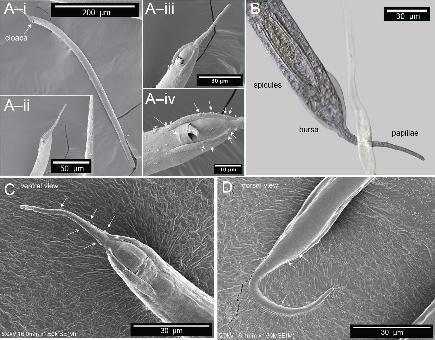 Males are relatively uncommon (~1%) in the population. From a dissecting microscope, the most obvious distinguishing characteristic of males is a body shape that narrows abruptly in the tail region, filiform for 8.1% of their length on average. Moreover, males present as slightly larger than females (Table 1, Fig. 9). The papillae pattern differs between females (Fig. 5) and males (Fig. 6). One single genital papilla can be found on the mid-ventral pre-cloacal surface on average 5.4 µm from cloacal opening of males (Figs. 6A,C). The male tail is enveloped by a conspicuous bursa (Fig. 6). The pattern of genital papillae associated with bursa are as follows: four papillae on each side arranged in an arc with a larger gap between two pairs of two (2 + 2) and all posterior to the cloacal opening (Figs. 6A,C). Three pairs of caudal papillae present posterior to bursa (Figs. 6B–D), including one pair of small “mid-tail” lateral papillae that can be seen in the ventral or dorsal view in males (Figs. 6B–D). The mean distance from each papilla to the caudal opening is shown in Figure 11A. The spicule is long and slightly arcuate, with ventral:dorsal extensions on either side below the tip, while the gubernaculum is short and funnel-shaped without apophysis (Figs. 11B–D).
