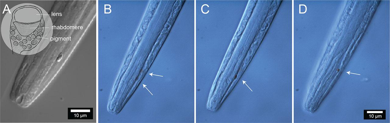 Photoreceptors of Diplolaimelloides woaabi sp. nov. (A) Anterior body end showing the position of one of the ocelli and detail of the pigment area. Inset shows a schematic reconstruction based on the ultrastructure of an ocellus, adapted from a TEM photograph (Van De Velde and Coomans, 1988). Anterior body end of a different specimen, showing the positions and colored pigment of (B) both, (C) one, and (D) the other ocelli.