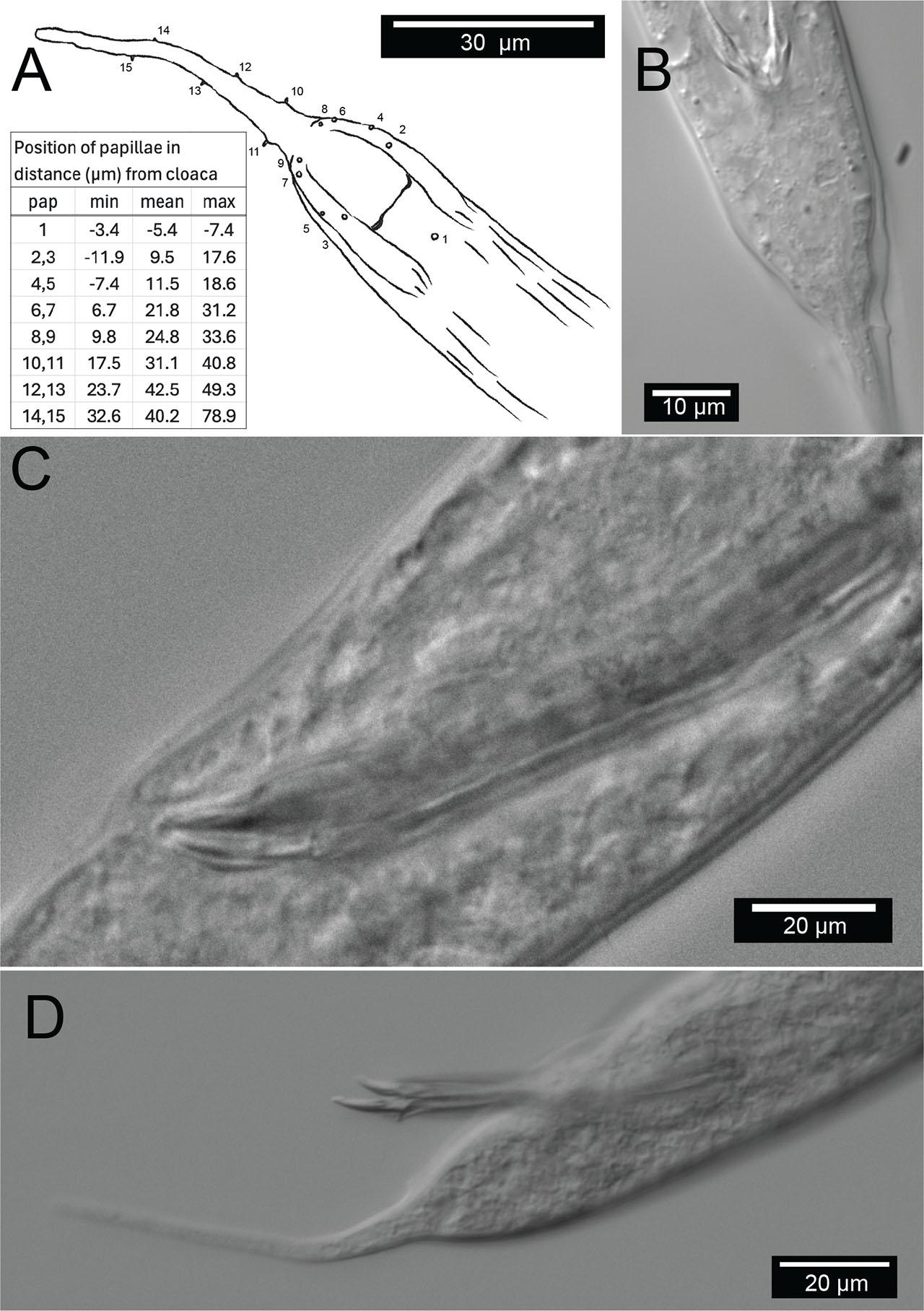 D. woaabi sp. nov. exhibits two ocelli. The amphids are circular, with a mean distance from the anterior at 15.8 µm in females and 15.7 µm in males. Sexual dimorphism of tail lengths include males with shorter tails than females and larger De Man’s c ratios (10 µm in males and 4.8 µm in females, Table 1). Long curved spicules and funnel-shaped gubernaculum without apophysis are seen. Spicules with ventral:dorsal extensions on either side resemble a “halberd” (Figs. 6A; 11B–D). One mid-ventral pre-cloacal papilla is located at an average of 5.4 µm from the cloaca in males. Caudal bursa exhibit four pairs of papillae in a (2 + 2) arrangement (first pair 10.2 µm and 15.4 µm from cloaca, second pair 23.1 µm and 25.4 µm from cloaca). D. woaabi sp. nov. also exhibit three post-bursal pairs: one at the base of the bursa, one offset pair more posterior but relatively anterior on the filiform part of the tail, and an additional, small, offset lateral pair approximately in the middle of the filiform part of the tail (Figs. 6B–D; 11A). Occasionally we observed small papillae near the proximal tip of the male tail, but it was too invariant or hard to see to be considered diagnostic.