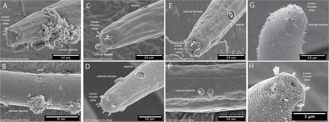 Scanning electron microscopy of body ornamentation or adherence of other organisms and/or substances on Diplolaimelloides woaabi sp. nov. that are (A–D) rod-like, (E,F) wart-like, or (G,H) fuzz-like.