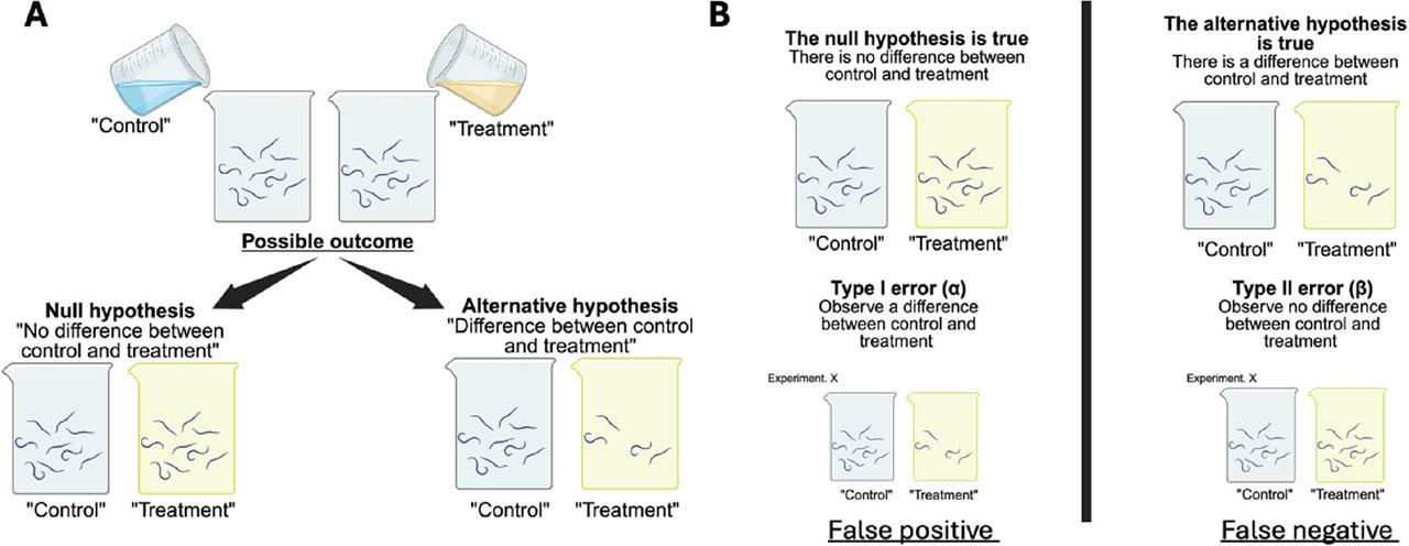 Illustration of hypothesis testing the effect of a treatment on nematode survival rate (A) and two types of errors that could occur (B). Figure created with Biorender.com.