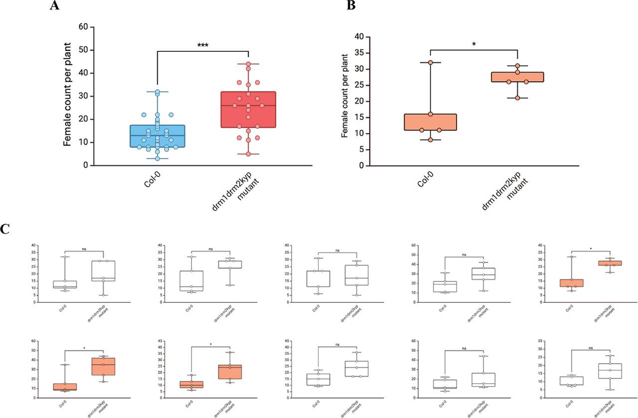 To illustrate how sample size can influence statistical conclusions, we reanalyzed a published dataset evaluating the susceptibility of hypomethylated Arabidopsis thaliana mutant line (drm1drm2kyp) to the sugar beet cyst nematode Heterodera schachtii (Ko et al., 2024). Based on the total number of female nematodes per plant, it was concluded that the drm1 drm2 kyp mutant plants are significantly more susceptible than wild-type (Col-0) Arabidopsis (Fig. 2A)