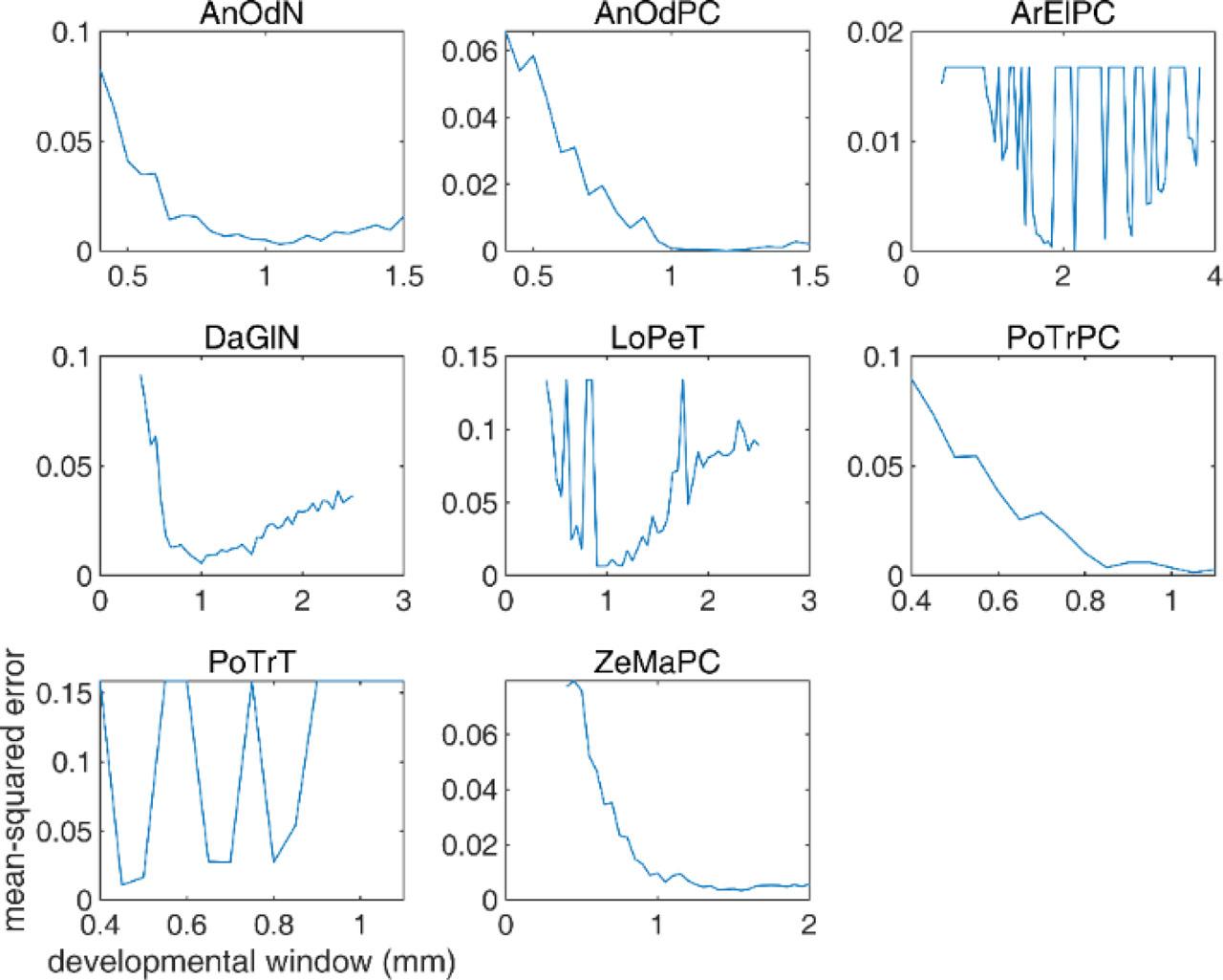 Within species, the mean-squared error shapes also vary. For AnOdN and AnOdPC, the optimal development window values range from 1.05 mm to 1.25 mm, and the error curves are similar. In the case of PoTrT and PoTrPC species, the error curves differ significantly.