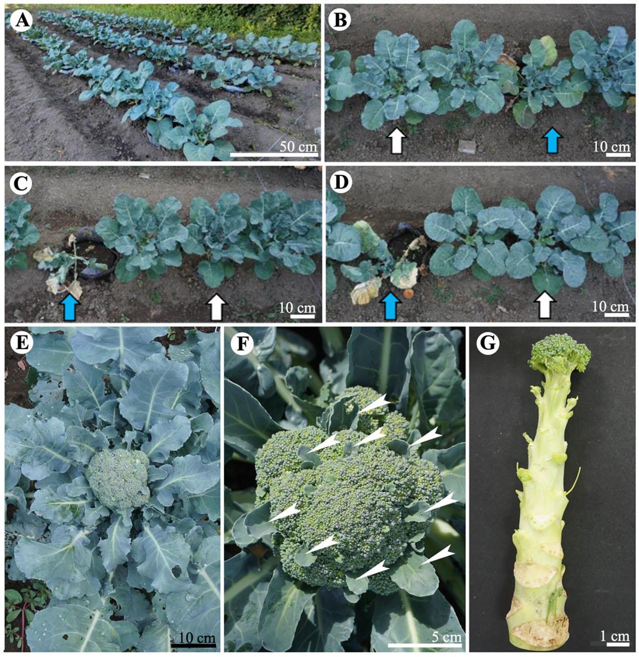 The entire site of the field experiment (A), three broccoli cultivars on the 6th day after waterlogging treatment (71–74 days after sowing) in 2021 (white and blue arrows indicate CONT and WET, respectively): ‘Shigemori’ (B), ‘Sawayutaka’ (C), and ‘First Star’ (D), head of ‘Shigemori’ in CONT at harvest stage (E), “leafy” head of ‘Shigemori’ (white arrows indicate leafy symptom) in CONT (F), flower head of ‘First Star’ in WET (G)