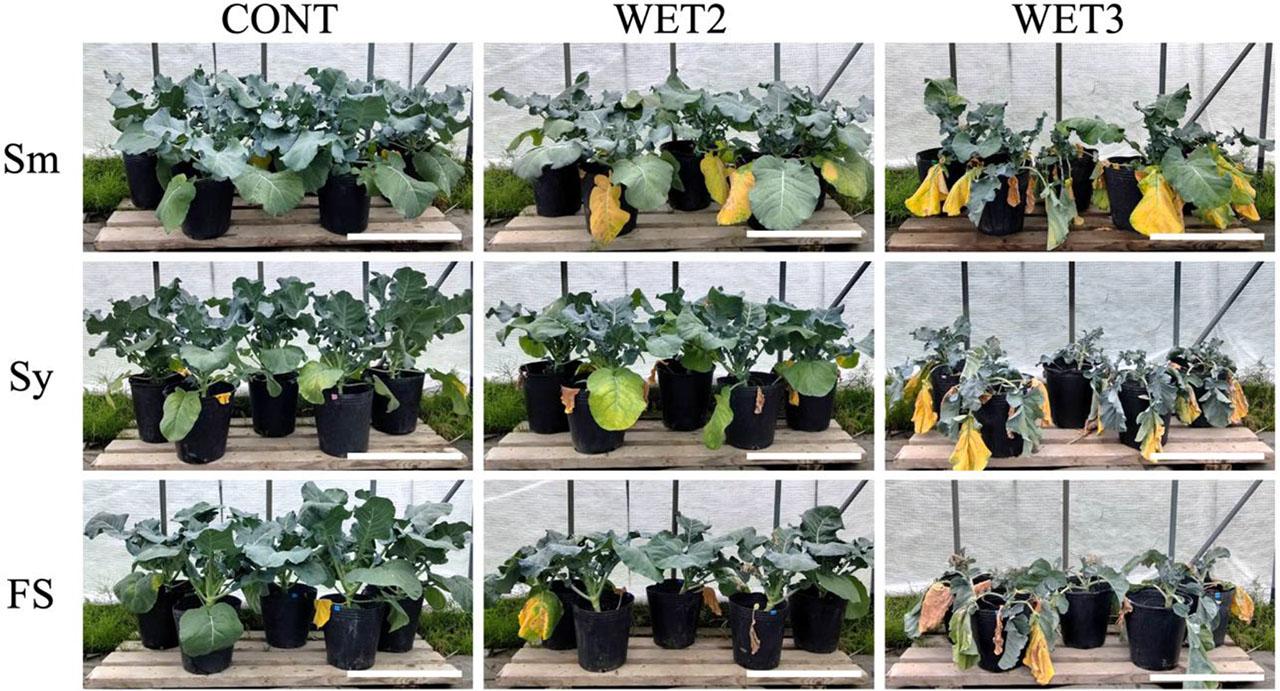 The impact on broccoli's biomass reduction by the waterlogging treatments looked different between the two years. For example, the percentages of the decrease in shoot biomass of all cultivars in WET3 from CONT tended to be more severe in 2020 than in 2021 [Sm: 40% (2020) < 51% (2021); Sy: 16% (2020) < 37% (2021); FS: 9% (2020) < 23% (2021)].