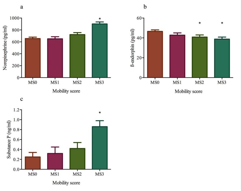 The aim of the present study was to determine the plasma concentrations of NE, BE, and SP in dairy cows with lameness and different mobility scores.