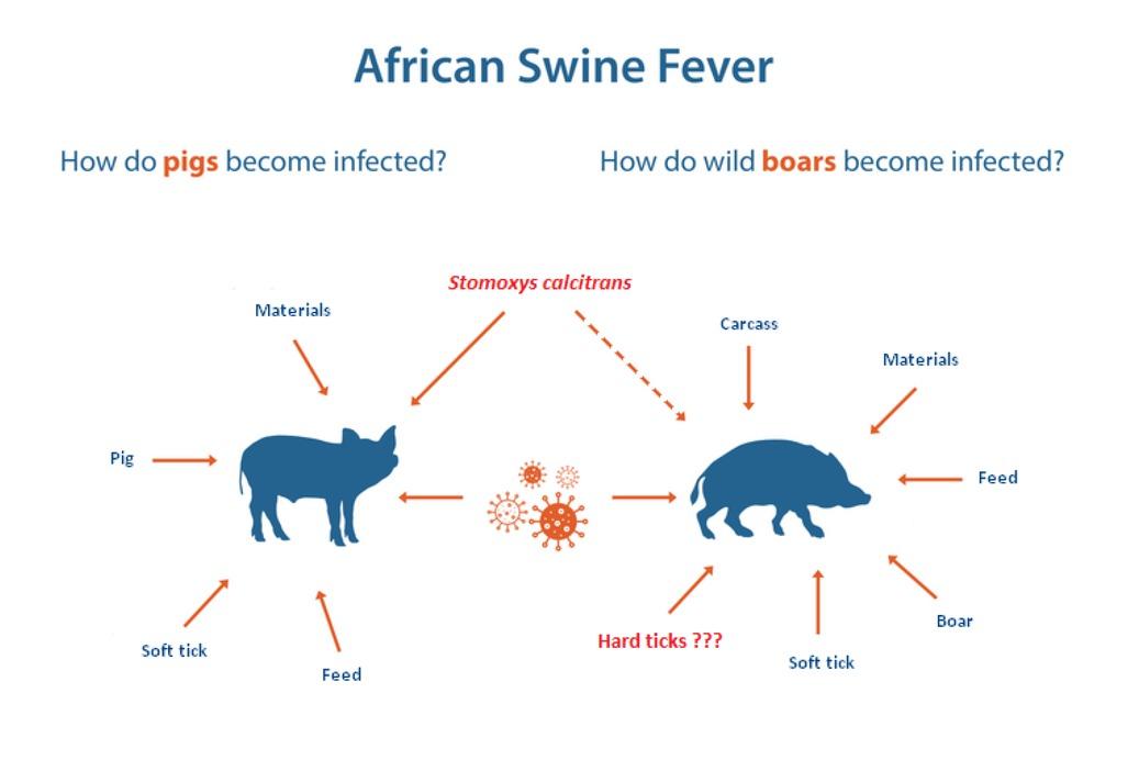 Probable routes of ASFV transmission to pigs and wild boars. Flies as vectors of pathogenic microorganisms for pigs