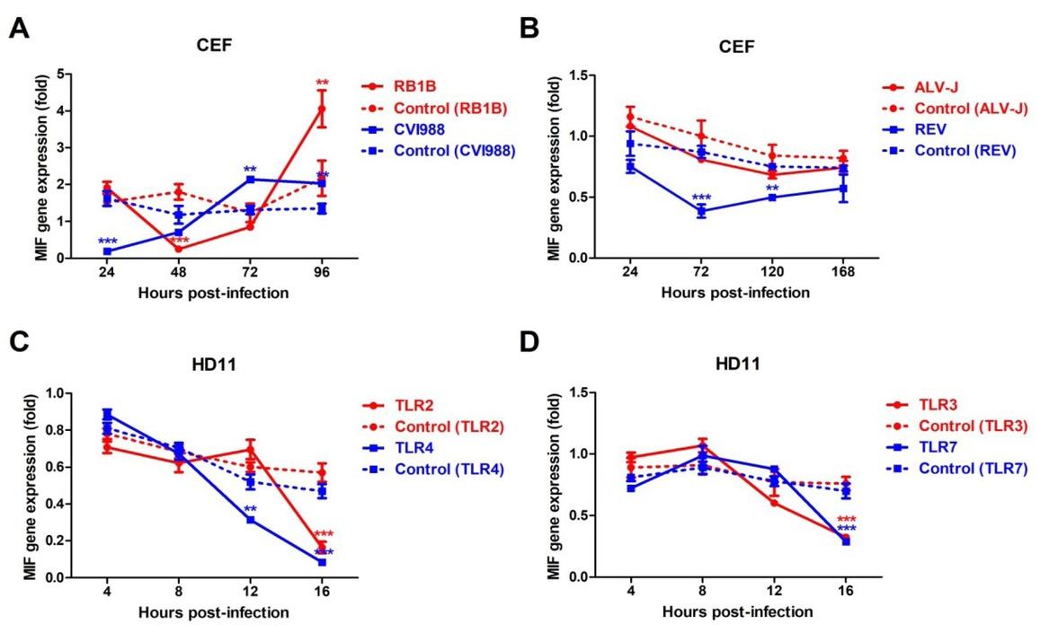 MIF expression in CEF and HD11 cells. A – expression of MIF in CEF cells infected with RB1B or CVI988 strain; B – expression of MIF in chicken fibroblasts infected with REV or ALV-J; C – expression of MIF in HD11 in response to TLR2 and four stimulations; D – expression of MIF in CEF in response to TLR3 and TLR7 stimulations. The different number of asterisks (*) indicates statistically significant difference for the comparison of control (uninfected or untreated) and infected (or stimulated) transcripts at the same time point as determined by Student’s t-test. ** – P < 0.01, *** – P < 0.001. Error bars represent standard error