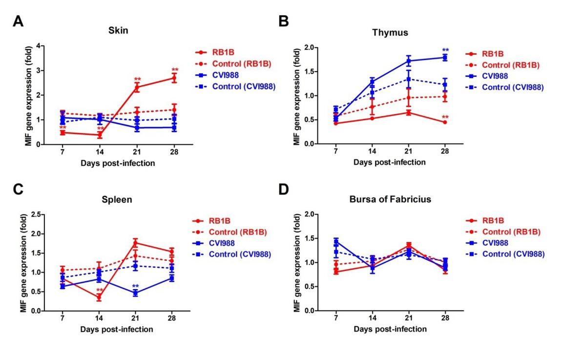 Differential expression pattern of MIF in chicken tissues. MIF expression was significantly diminished (P < 0.01 and FC > 2) in RB1B-infected chicken skin at 7 and 14 dpi and elevated at 21 and 28 dpi, whereas it did not show any significant change in CVI988-infected chicken skin at the same time points (Fig. 2A). Reduced expression of MIF was also observed in RB1B-infected chicken thymus at four time points while the MIF expression trend was persistently increased from 7 to 28 dpi in CVI988-infected chicken thymus (Fig. 2B). In the spleen, MIF expression was slightly reduced by CVI988 infection and significantly downregulated (P < 0.01 and FC > 2) at 21 dpi. MIF expression level was also significantly decreased (P < 0.01 and FC > 2) by RB1B infection at 14 dpi while obviously upregulated at 21 and 28 dpi (Fig. 2C). In addition, we did not find any significant change of MIF expression in chicken bursa of Fabricius infected with RB1B or CVI988 strains (Fig. 2D).