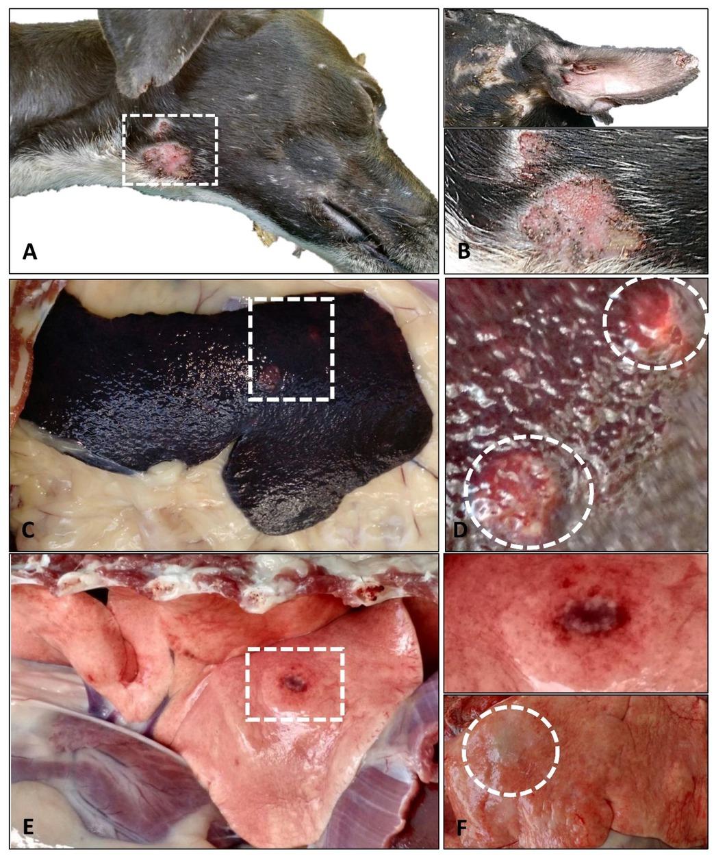 Macroscopic lesions in dogs with leishmaniasis in a central region of Colombia. A, B – skin lesions (exfoliative and ulcerative dermatitis) on the head, neck, and ears (Fig. B lower panel is a magnification of the delineated square in A). C, D – splenomegaly with nodules protruding on the irregular surface of the organ (Fig. D is a magnification of the delineated square in fig. C). E, F upper panel – ulcerated nodule in the lung (Fig. F upper panel is a magnification of the delineated square in Fig. E). F lower panel – a non-ulcerated nodule protruding from the surface of the lung of a different dog