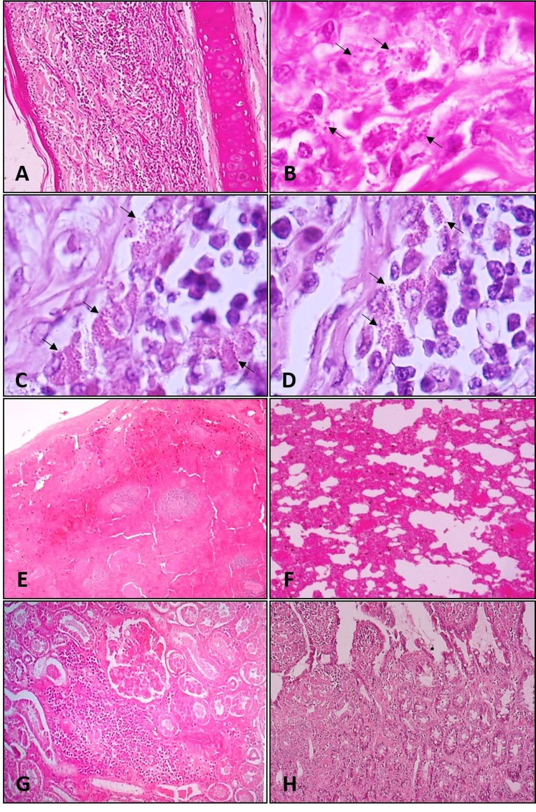 Microscopic lesions in dogs with leishmaniasis in a central region of Colombia. A, B – auricular dermatitis associated with intracellular amastigotes present within macrophages (arrows). C, D – lymphadenitis showing abundant promastigotes parasites (arrows) within phagocytic mononuclear cells. E – spleen with severe depletion of lymphocytes (white pulp) and apparent hyperplasia of red pulp. F – lung with moderate to severe interstitial pneumonia. G – kidney showing interstitial nephritis with tubular degeneration. H – small intestine showing lymphoplasmacytic infiltrate