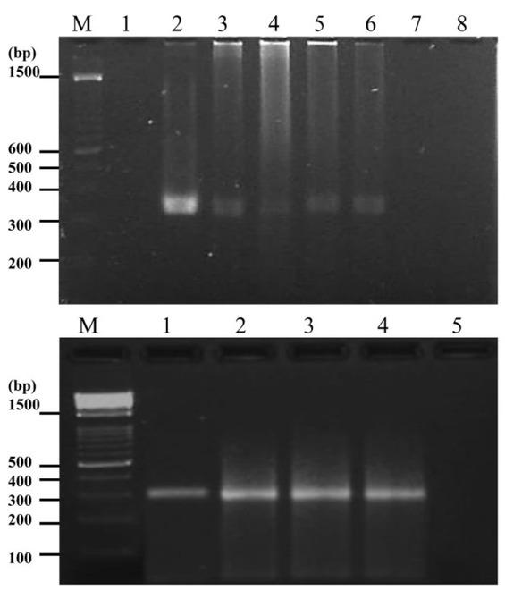 PCR Amplification of a 314 bp DNA fragment of a Leishmania RNA gene. Upper panel – M:100 bp ladder. Lane 1 – negative control (without template DNA). Lane 2 – positive control of L. amazonensis. Lane 3 – spleen. Lane 4 – skin. Lanes 5, 6 – lymph nodes. Lane 7 – positive control of L. infantum. Lane 8 – positive control of L. braziliensis. Lower panel – M: 100 bp ladder. Lane 1 – positive control of L. amazonensis. Lanes 2–5 – spleen samples from three serological positive dogs
