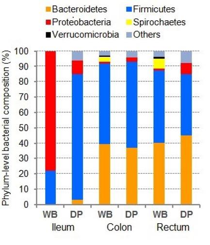Phylum-level bacterial composition of the microbiota in three sections of the gastrointestinal tract of the diarrhoeic wild boar (WB) from Hungary analysed in this work in comparison with those established earlier for the domestic pig (DP) by a meta-analysis (13)