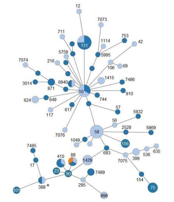 GrapeTree diagram generated in EnteroBase based on seven-gene MLST profiles of 104 E. coli strains isolated in Europe from wild boars and domestic pigs (2, 28, 29). Countries of origin (and number of strains): Denmark (48), Hungary (8), Czech Republic (7), Spain (7), Ireland (6), Luxembourg (5), Italy (4), Switzerland (3), United Kingdom (3), Croatia (2), France (2), Germany (2), Portugal (2), Austria (1), Belgium (1), Bulgaria (1), Netherlands (1), and Sweden (1). Dark blue, light blue, and orange indicate E. coli isolates of domestic pig, wild boar, and food origin, respectively. Numbers stand for sequence types by the Achtman seven-gene MLST scheme (28). The node size in the GrapeTree diagram is proportional to the number of bacterial strains with the same sequence type (ST), and the length of edges are proportional to inter-node genetic distances (29). ST388 determined for the E. coli O112ab:H2 strain characterised in this work is marked by an asterisk (*)