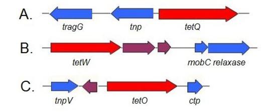 Acquired tetracycline, macrolide, and β-lactam resistance determinants in the gut microbiota of free-living wild boars in Hungary and Japan. Bioinformatic analysis of shotgun metagenomic contigs of the colon and rectal microbiome of the diarrhoeic wild boar from Hungary identified tetQ, tetW, and tetO tetracycline resistance genes and the mefA macrolide resistance determinant. These four genes were also detected by PCR and Sanger sequencing in total faecal DNA of four additional free-living wild boars from the Zemplén Mountains, Hungary. Sequence analysis of the metagenomic contigs covering the immediate genetic environment of the tetracycline resistance determinants identified various genes and functions characteristic of mobile genetic elements. These genes included those of an IS1380 family transposase and a TraG conjugal transfer protein for tetQ; a relaxase and a mobilisation protein MobC for tetW; and a transposon-encoded TnpV protein and a conjugal transfer protein for tetO (Fig. 3). The wild boar metagenomic contig harbouring tetQ shared a high level of identity (87%–94%) with two sections of the CTnHyb conjugative transposon of the Bacteroides fragilis strain HMW 615, which also carries a tetQ gene (GenBank accession number KJ816753). The wild boar metagenomic contig harbouring tetO also shared a high level of identity (99%) with a section of the integrative and conjugative element ICESsuZJ20091101-1 of the Streptococcus suis strain ZJ20091101, which likewise carries a tetO gene (GenBank accession number KX077882).
