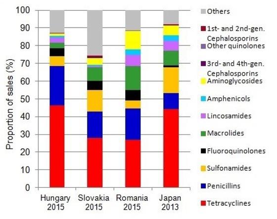 Land application of sewage sludge or manure from livestock farms containing antibiotic-resistant microbes and antibiotic residues may facilitate the selection and dissemination of resistant strains into both agricultural areas and natural habitats (12). According to surveillance data on the sales of veterinary antimicrobial agents (4, 9), the predominant products sold and used both in Europe and Japan for food-producing animals are tetracyclines (Fig. 4). In Hungary and Japan, tetracyclines respectively constituted 46.2% and 44.1% of the total sales of active ingredients of veterinary antimicrobial agents for food-producing animals. Significant associations were previously found between country-specific antimicrobial usage and acquired antimicrobial resistance levels in livestock populations (17). The prevalence of the tetQ gene in deer faeces was found to be spatially associated with concentrated animal feeding operations and with land-applied biosolids and livestock manure (20). In a recent study in Europe involving 181 domestic pig farms in nine European countries, the amount of tetracyclines and macrolides used was established to be particularly associated with the abundance of tetracycline and macrolide resistance genes (25), providing robust evidence for the direct selection of resistance genes by these two antibiotic classes.