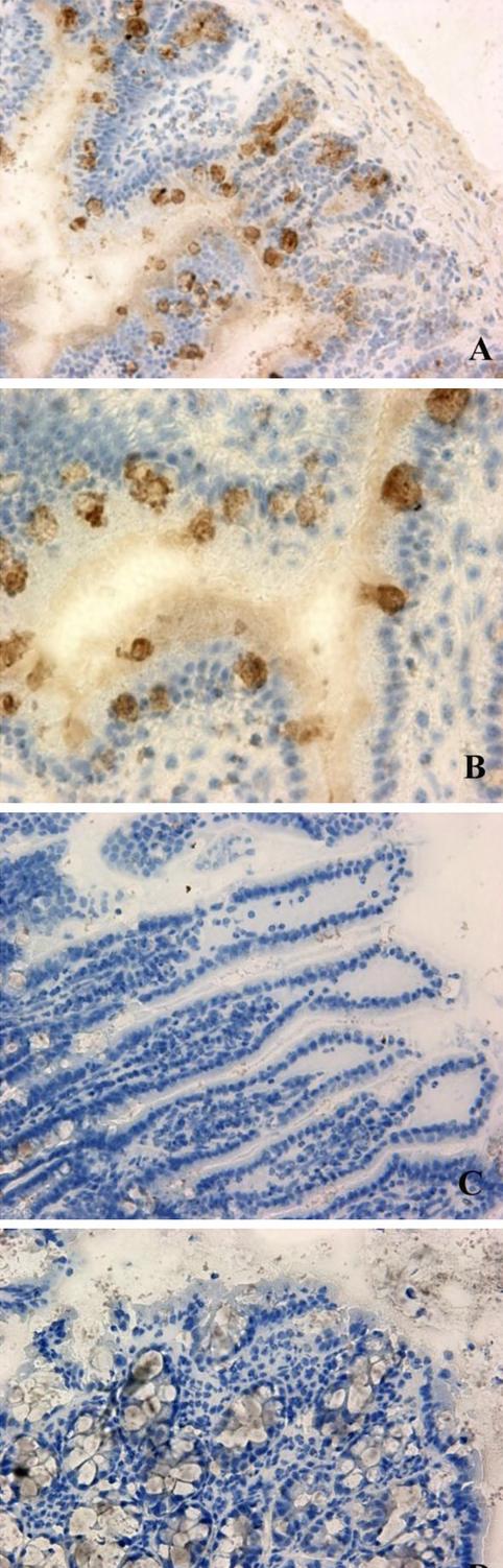 A – jejunum of T. spiralis-infected mouse at 4 dpi with many brown-stained, TLR2-positive epithelial cells (20×);