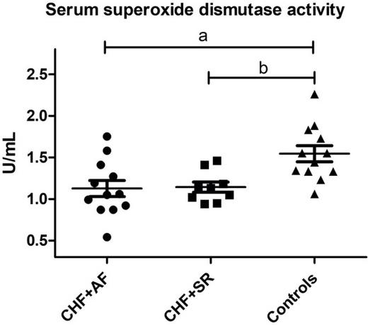 Comparison of the serum superoxide dismutase activity among the three groups. a – P < 0.01; b – P < 0.05