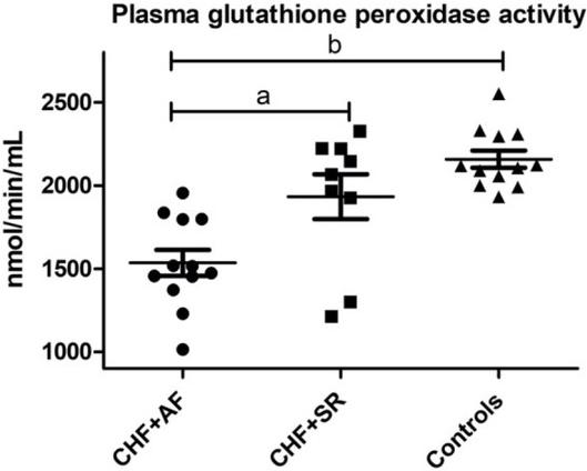 Comparison of the plasma glutathione peroxidase activity among the three groups. a – P < 0.05; b – P < 0.001