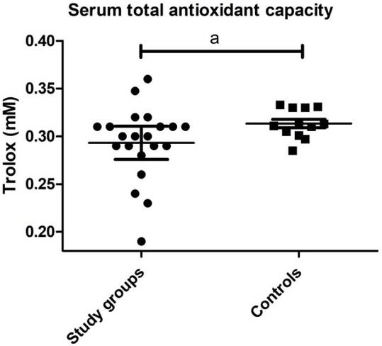 Comparison of the serum total antioxidant capacity between cardiac patients (merged CHF + AF and CHF + SR groups) and healthy controls. a – P < 0.05