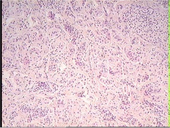 The minute foci of granulosa cell tumour associated with adenoma of rete ovarii cells the ovary of a dairy cow with an adenomyotic uterus. HE, 20×