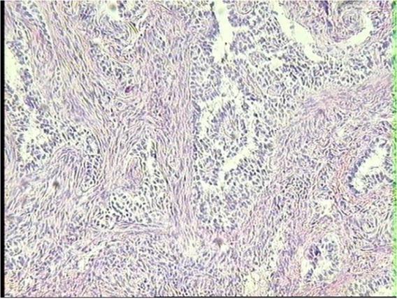 Adenocarcinoma of rete ovarii cells in the ovary of a dairy cow with adenomyotic uterus. HE, 40×