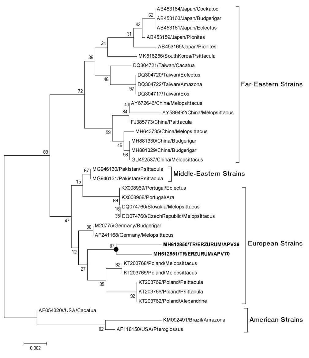 The APV positivity rate was 48.7% for all bird sellers together. M. undulatus was the species of origin of 54 positive samples and N. hollandicus gave one positive sample. The VP1 gene as it appears in the phylogenetic tree for APV shows two main clades (Fig. 1). The tree indicates that the Polyomavirus sequences in this study, which are one designated TR/Erzurum/ APV36 from N. hollandicus under GenBank accession number MH612850 and one designated TR/Erzurum/APV70 from M. undulatus under GenBank accession number MH612851, were genetically distinct from the GenBank database Far Eastern and American strains submitted from those regions, whereas they were more closely related to M. undulatus-derived strains from Poland. An observation of note is that the TR/Erzurum/APV36 strain (isolated from N. hollandicus) formed a separate small cluster with the TR/Erzurum/APV70 strain (isolated from M. undulatus), indicating very high similarity. The three Polish strains that were reported in 2015 were grouped with the European strains, whereas the German strains that were reported in 1988 were placed in a separate cluster.