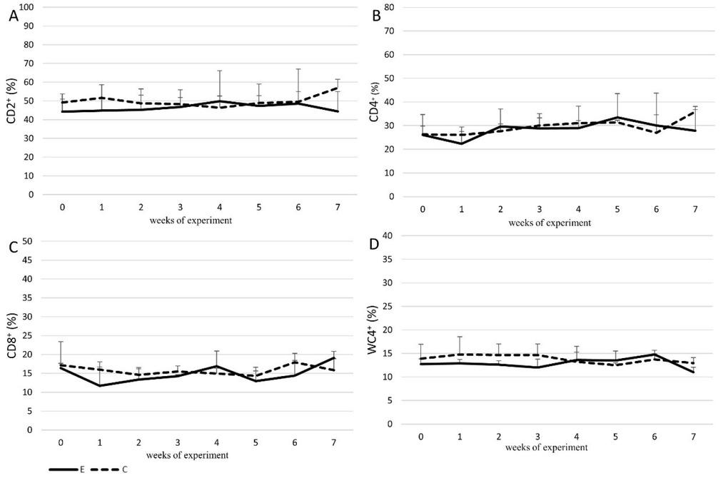 Immunophenotyping of lymphocytes. Cytometric determination of the percentage of lymphocyte subpopulations with CD2+ and CD4+ surface antigens in the peripheral blood of the calves revealed that the E group and C group percentages of these antigens were similar except for in the last week, when the values for the supplemented group were lower than those obtained for the control group. The percentage of the CD8+ lymphocyte subpopulation in the E group in weeks 1 and 6 of the study visibly decreased, but in week 7 it was slightly higher than that in the C group, and the percentage of the lymphocyte subpopulation expressing WC4+ in the E group up to week 3 and in the last week of the experiment had also lower values than that in the control calf group. In the remaining weeks, these values were comparable in both groups. No statistically significant differences in any examined lymphocyte subpopulations were found between the E and C groups throughout the experiment (Fig. 2).
