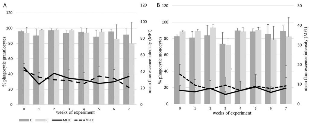Phagocytic activity of granulocytes and monocytes. Expressed as the percentage of phagocytic granulocytes, this activity in the E group was comparable to that in the C group, with the exception of weeks 6 and 7 of the experiment, when the values for the E group were higher than those for the C group, and weeks 1 and 5, when the values for the E group were lower than those for the C group. The MFI values for the phagocytic granulocytes of the E group were slightly higher for most of the study, i.e. in weeks 2, 3, 4 and 7, but lower in weeks 1, 5 and 6 than the C group values (Fig. 3A). No statistically significant differences were found between the E and C groups during the administration of the feed additive. The percentage of phagocytic monocytes for the E group was comparable to that of the C group, but slight differences were visible. These disparities were that in weeks 0, 1 and 2 the values for the E group were lower than those for the control, whereas in weeks 6 and 7 the percentage of phagocytic monocytes was higher in the E group than in the C group. The MFI for monocytes in the E group was lower or equal to that of the C group; however, no significant (P < 0.05) differences between the groups were observed (Fig. 3B).
