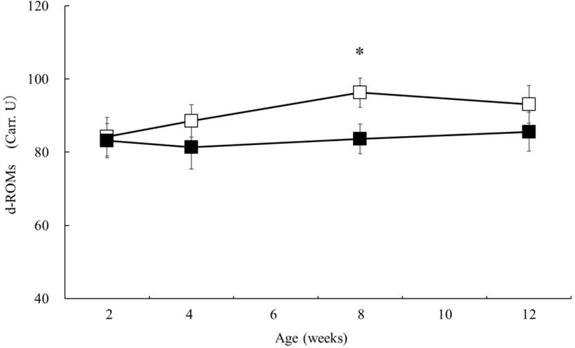Changes in serum derivatives of reactive oxygen metabolites (d-ROMs) in the VC group (solid squares) and the control group (hollow squares)