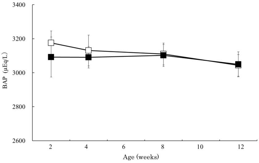 Changes in serum biological antioxidant potential (BAP) in the VC group (solid squares) and the control group (hollow squares)