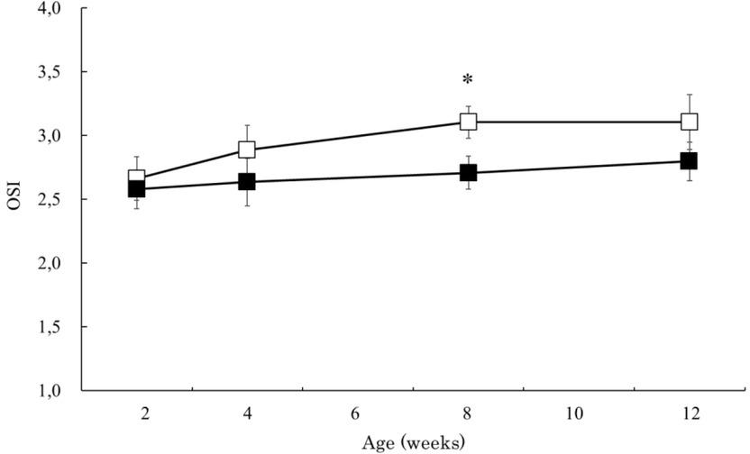 Data were expressed as the mean ± standard error. Statistical analysis was conducted to determine the differences between the two groups in the same weeks of age using Student’s t-test with SPSS statistics 24 software (IBM, Tokyo, Japan). P values less than 0.05 were considered statistically significant.