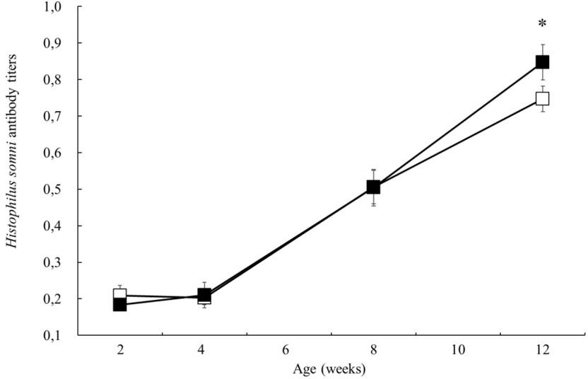 Changes in antibody titres against Histophilus somni in the VC group (solid squares) and the control group (hollow squares)
