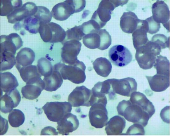 Representative cytological image of a bone marrow smear stained using the May–Grunwald–Giemsa method showing condensation and fragmentation of the nucleus of a neutrophil in the HD group. Magnification 1,000×