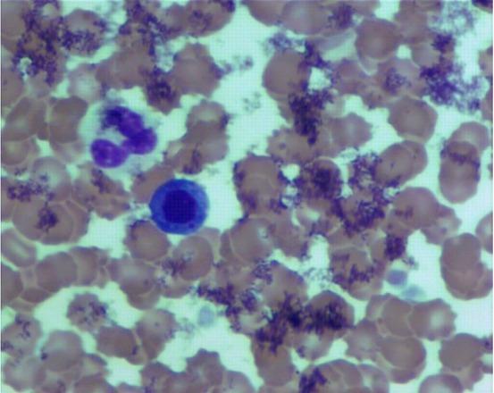 Representative cytological image of a bone marrow smear stained using the May–Grunwald–Giemsa method showing a basophilic myelocyte in the C group. Magnification 1,000×