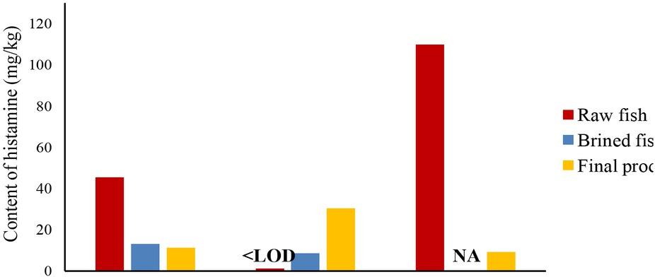Histamine content in the production stages of canned, marinated and smoked fish. LOD – limit of detection (2.13 mg/kg); NA – not applicable